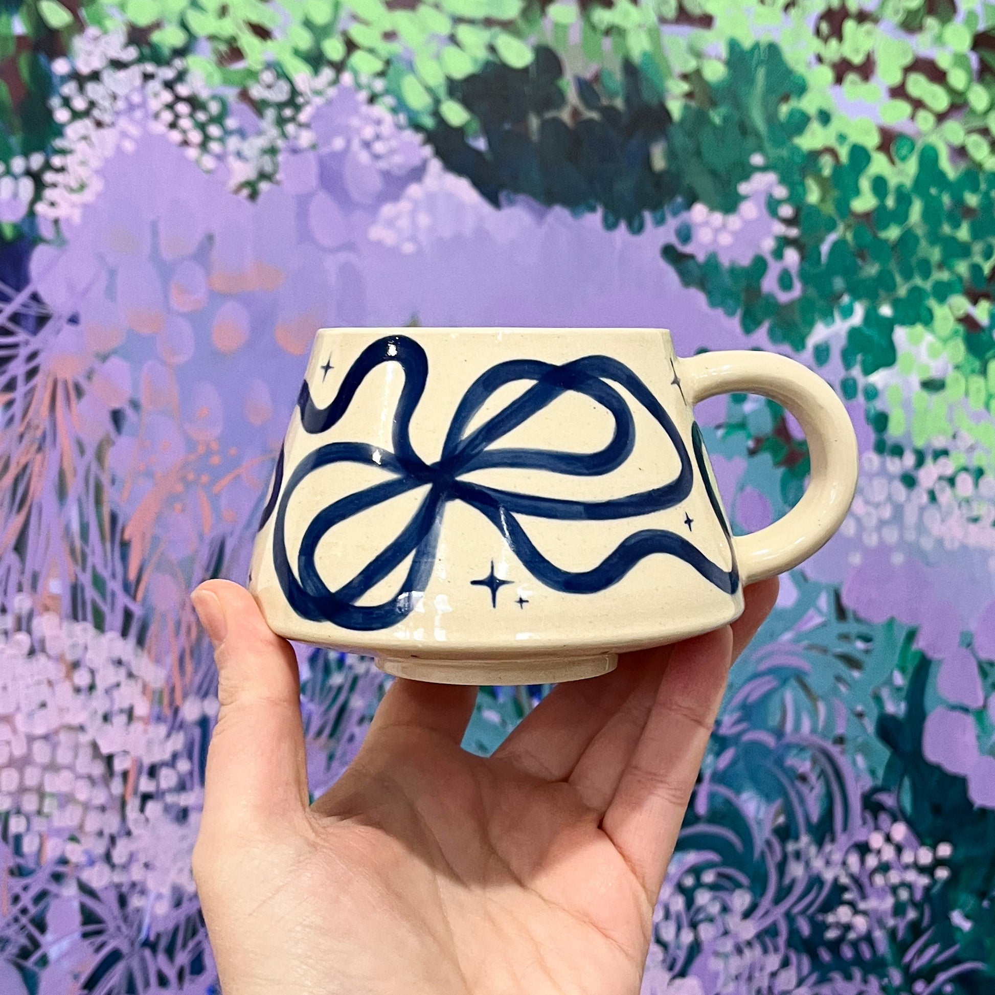 Mugs are made from stoneware clay and fired to cone 6. They are microwave and dishwasher safe, but hand-wash is preferred for longevity.