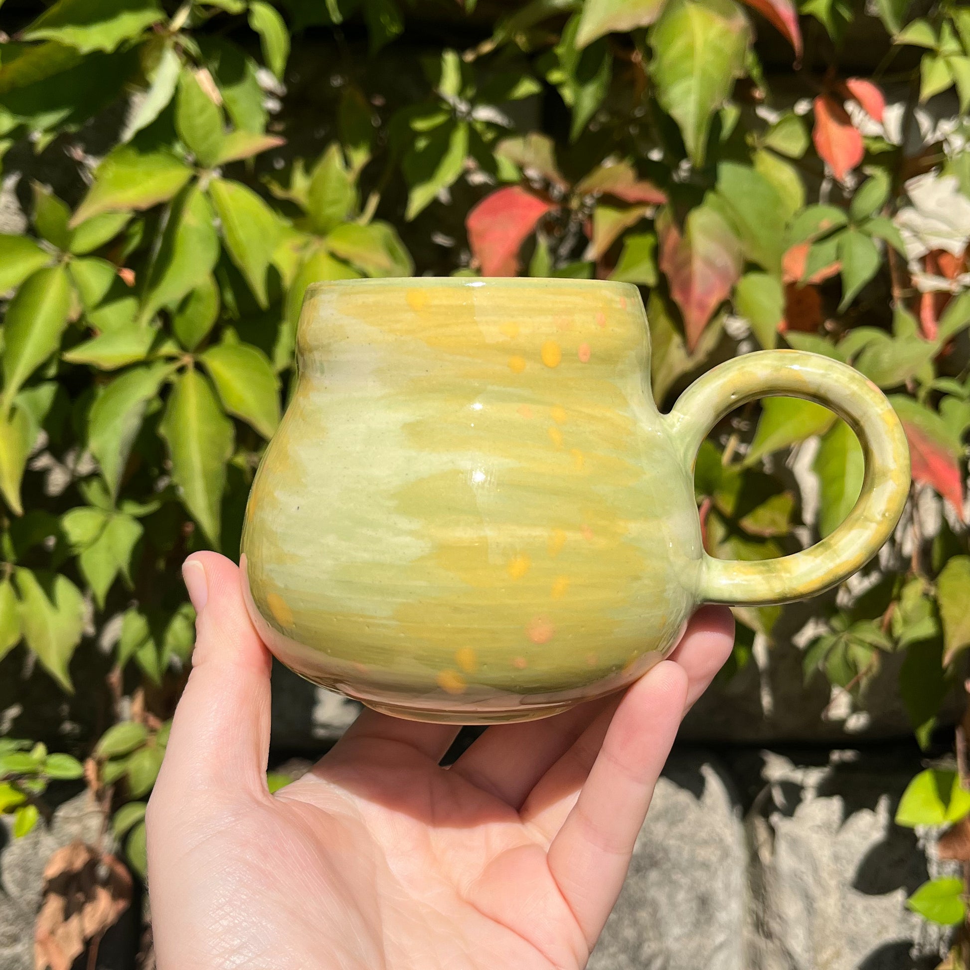 Ooooooh it's spooky time! Celebrate halloween this year by drinking out of a mug shaped kind of like a weird gourd with neat colors and a face! This one is a yellowish green with green and yellow accents and has a goofy alien face.