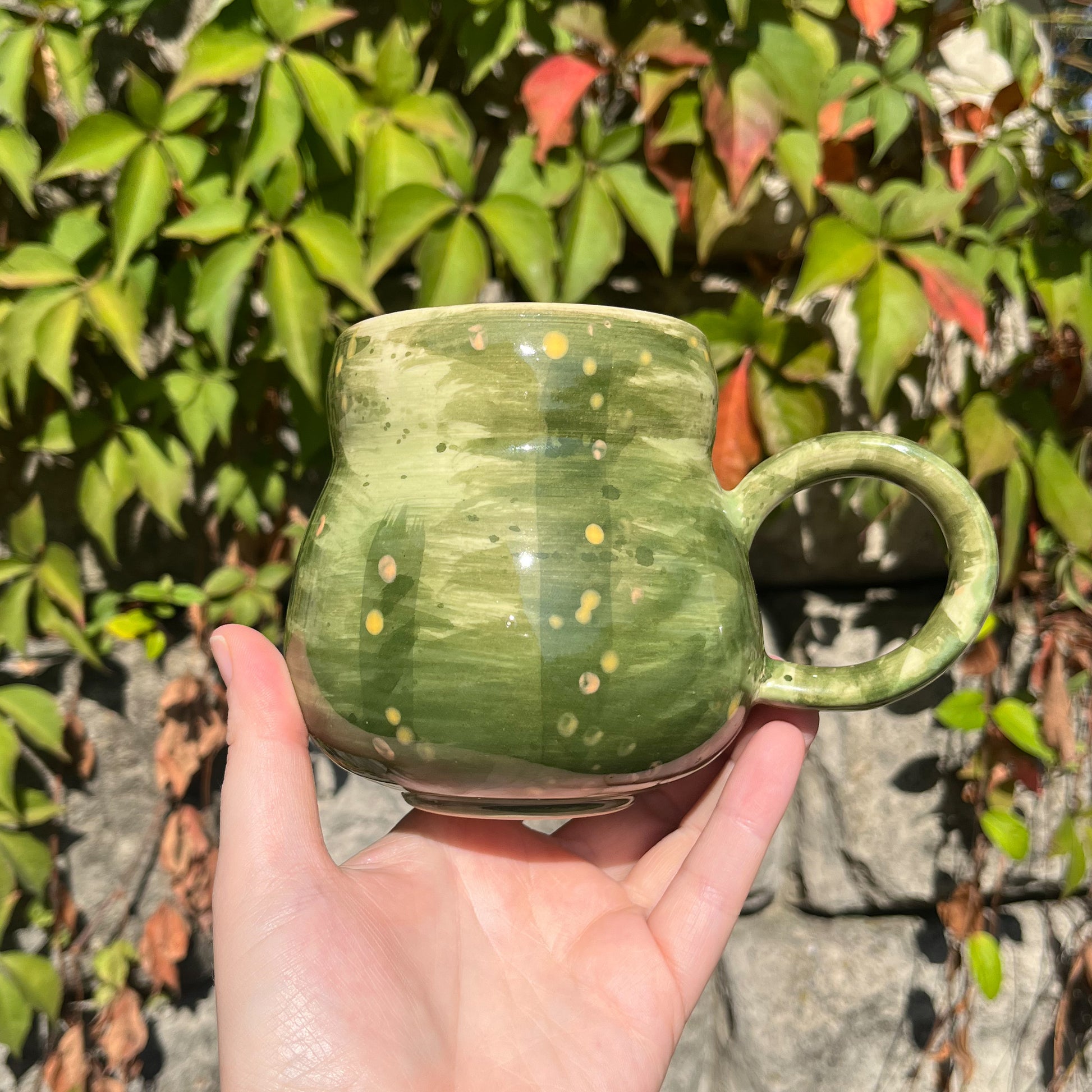 Ooooooh it's spooky time! Celebrate halloween this year by drinking out of a mug shaped kind of like a weird gourd with neat colors and a face! This one is green with green accents and has the most traditional jack-o-lantern type face.