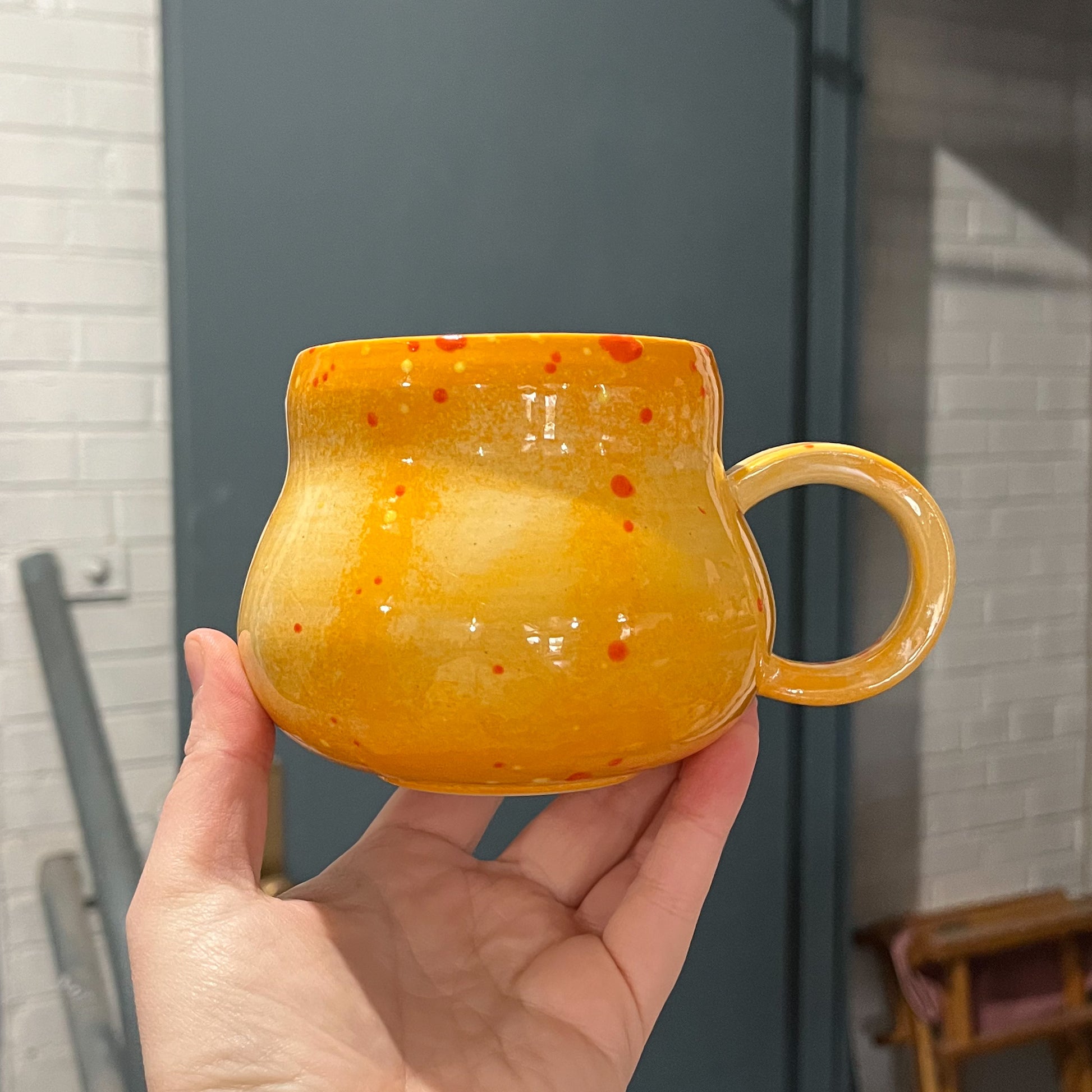 Ooooooh it's spooky time! Celebrate halloween this year by drinking out of a mug shaped kind of like a weird gourd with neat colors and a face!