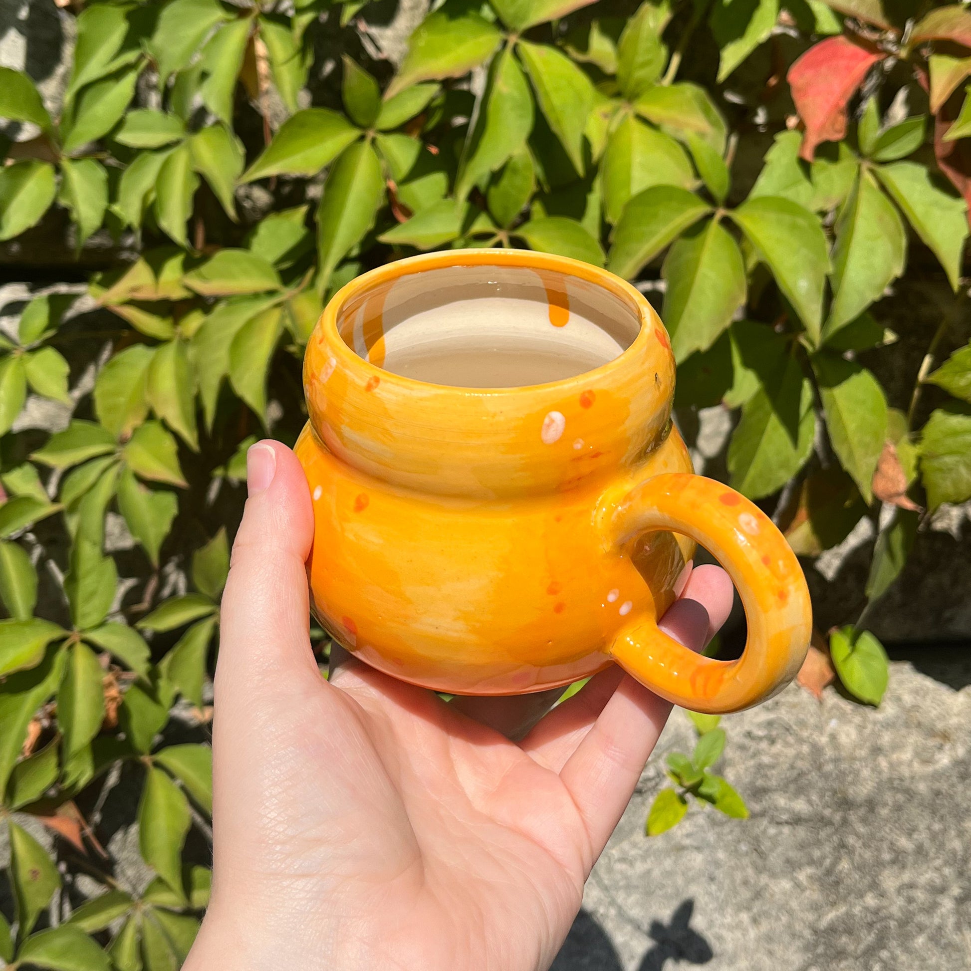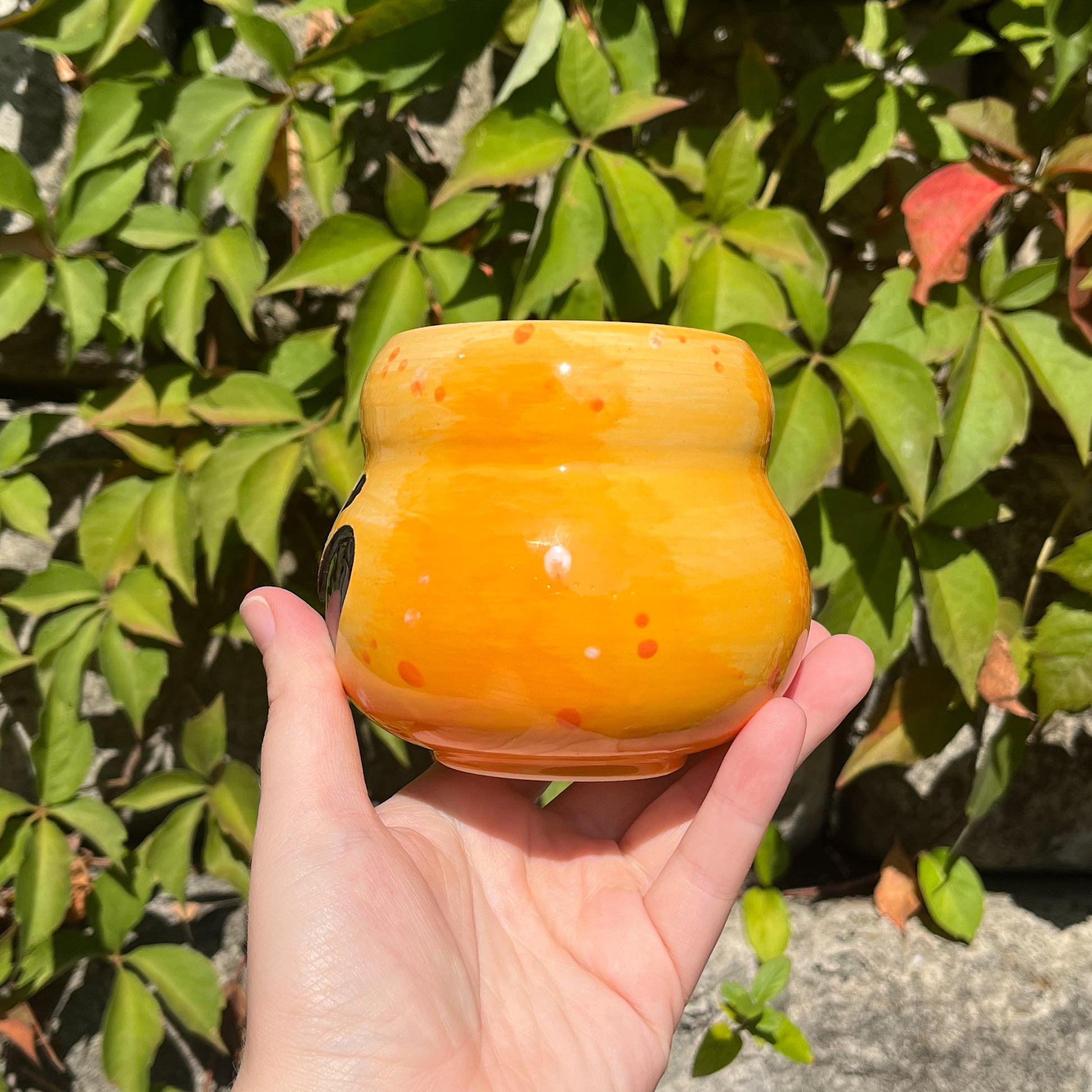 Ooooooh it's spooky time! Celebrate halloween this year by drinking out of a mug shaped kind of like a weird gourd with neat colors and a face! This one is orange with darker orange, white, and a goofy happy face.