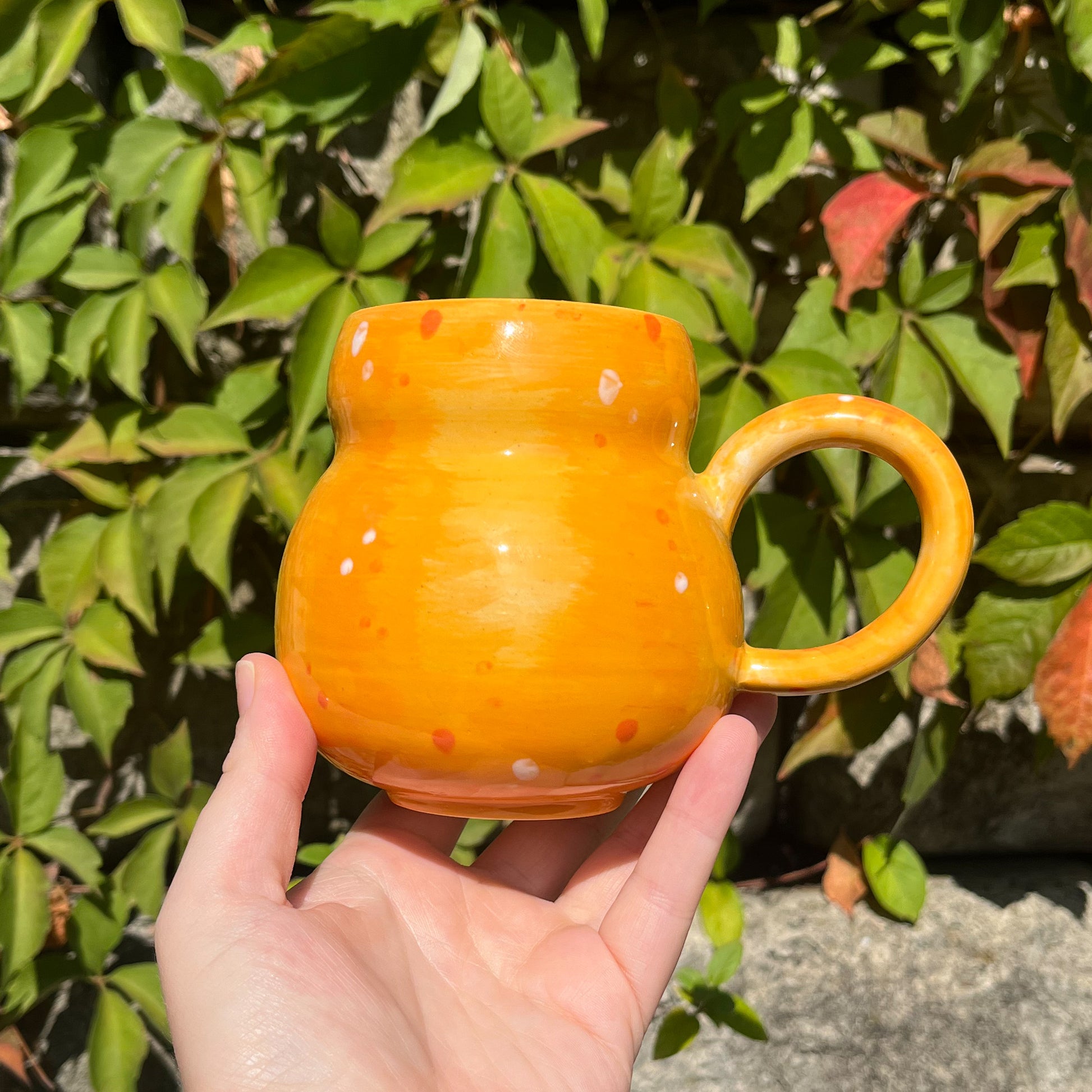 Ooooooh it's spooky time! Celebrate halloween this year by drinking out of a mug shaped kind of like a weird gourd with neat colors and a face! This one is orange with darker orange, white, and a goofy :O face.