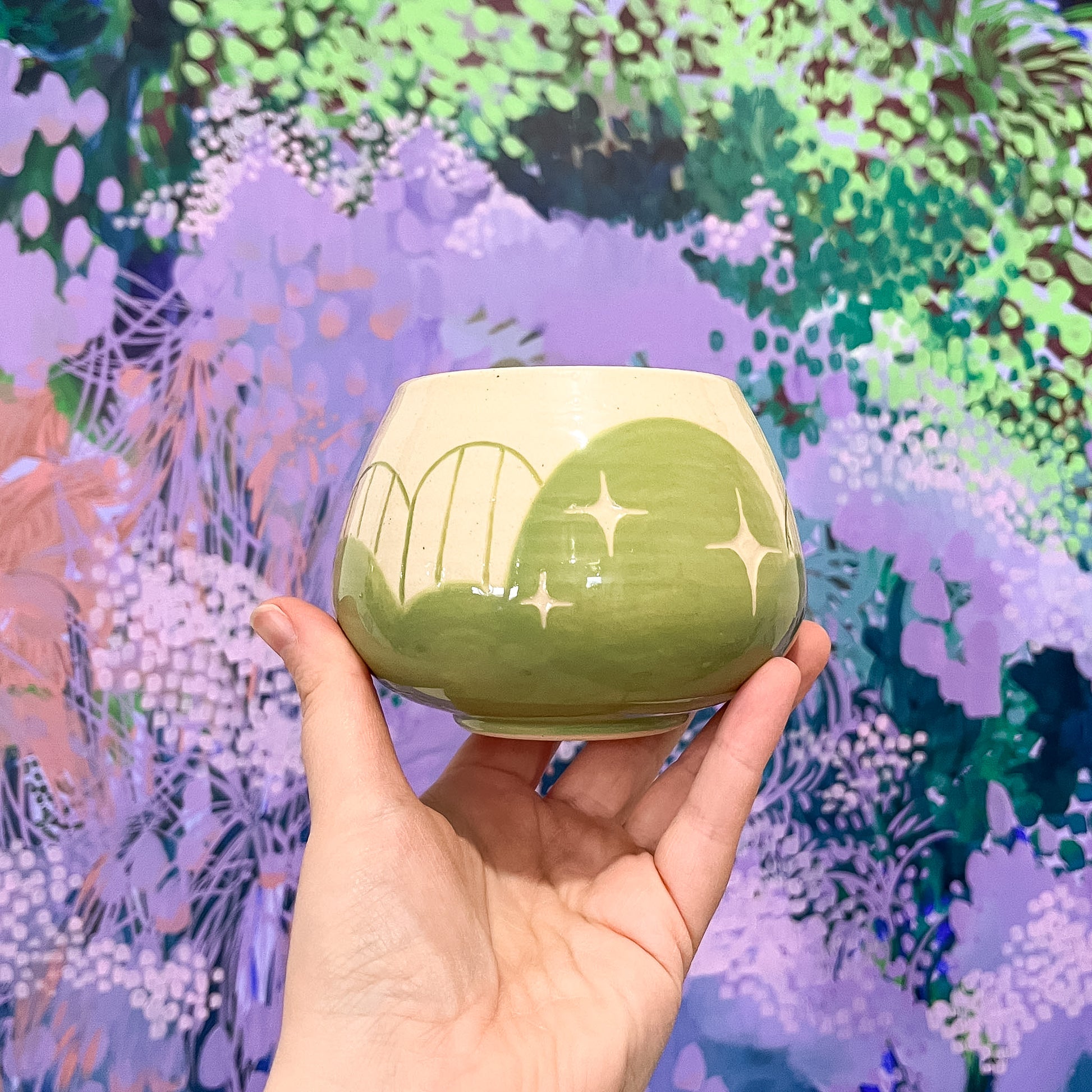 A tiny cloud classic! This mug features a green scalloped design with sparkle and stripe accents.
