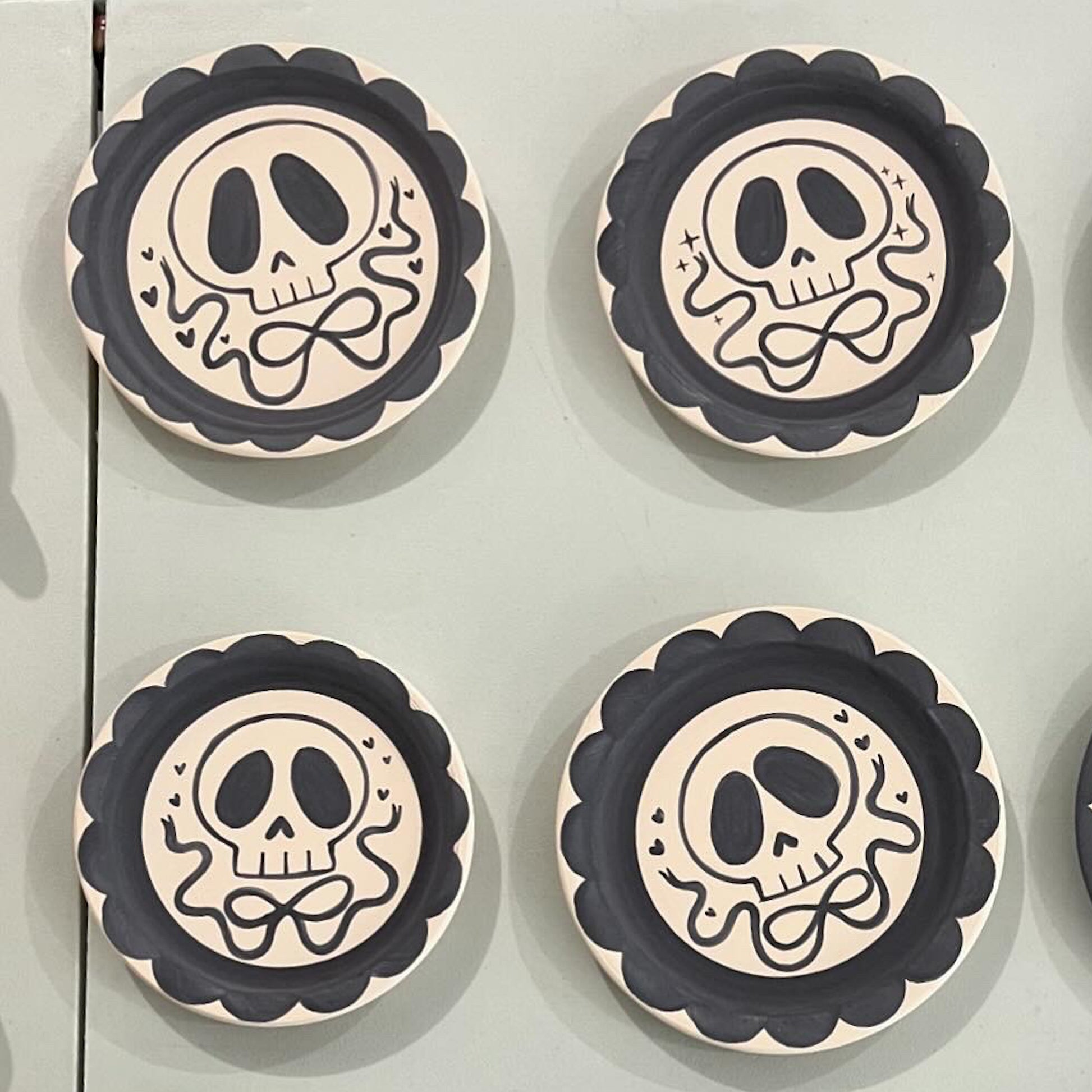 Each plate will be approximately 6" and features a delightful hand painted skull with a ribbon and sparkles or hearts on it. If you feel strongly about which you would like, please email me your order # and preference or else it'll be whatever I feel like doing :) They also have a very nice black scalloped border and will be finished off with a clear gloss glaze as shown in the second picture (of the single plate)